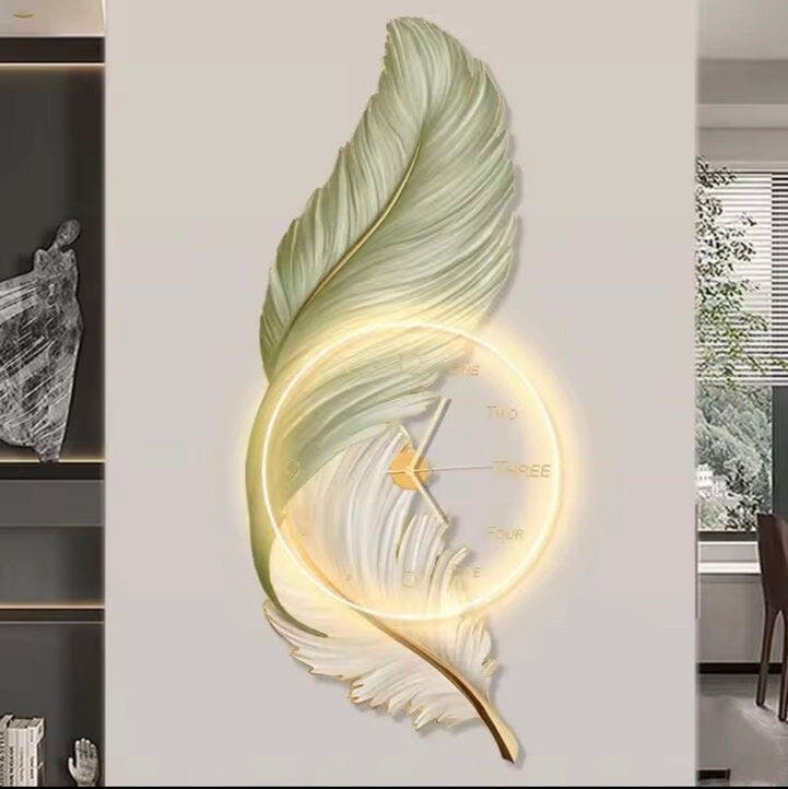 A true expression of sophistication, the Feather Glow LED Wall Clock elevates any modern interior with its artistic charm. The design features a sculpted dual-feather form in caramel gold and ivory tones, surrounded by a soft LED halo ring that highlights its graceful curves. Ideal for living rooms, hallways, or bedrooms, this clock brings together warm lighting, artful craftsmanship, and silent precision in one luxurious piece