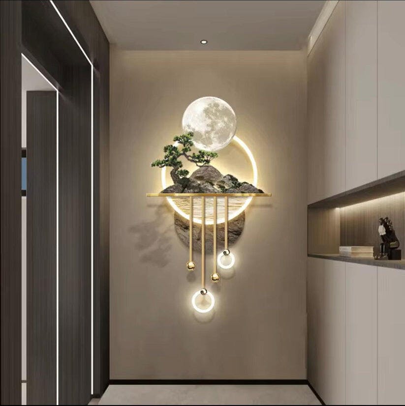 Lunar Harmony LED Wall Art Moonlight Glow with Bonsai & Golden Orbs